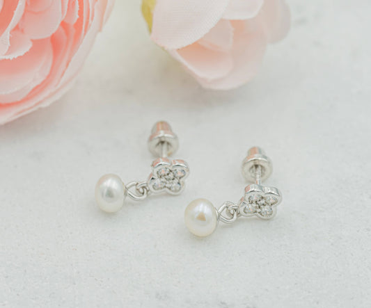 Sterling Silver Daisy w/Dangling Pearl Earrings Girls & Kids