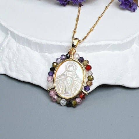 Gold-Plated Our Lady of Grace Mother of Pearl & Multicolor Zircon Necklace 18-inch
