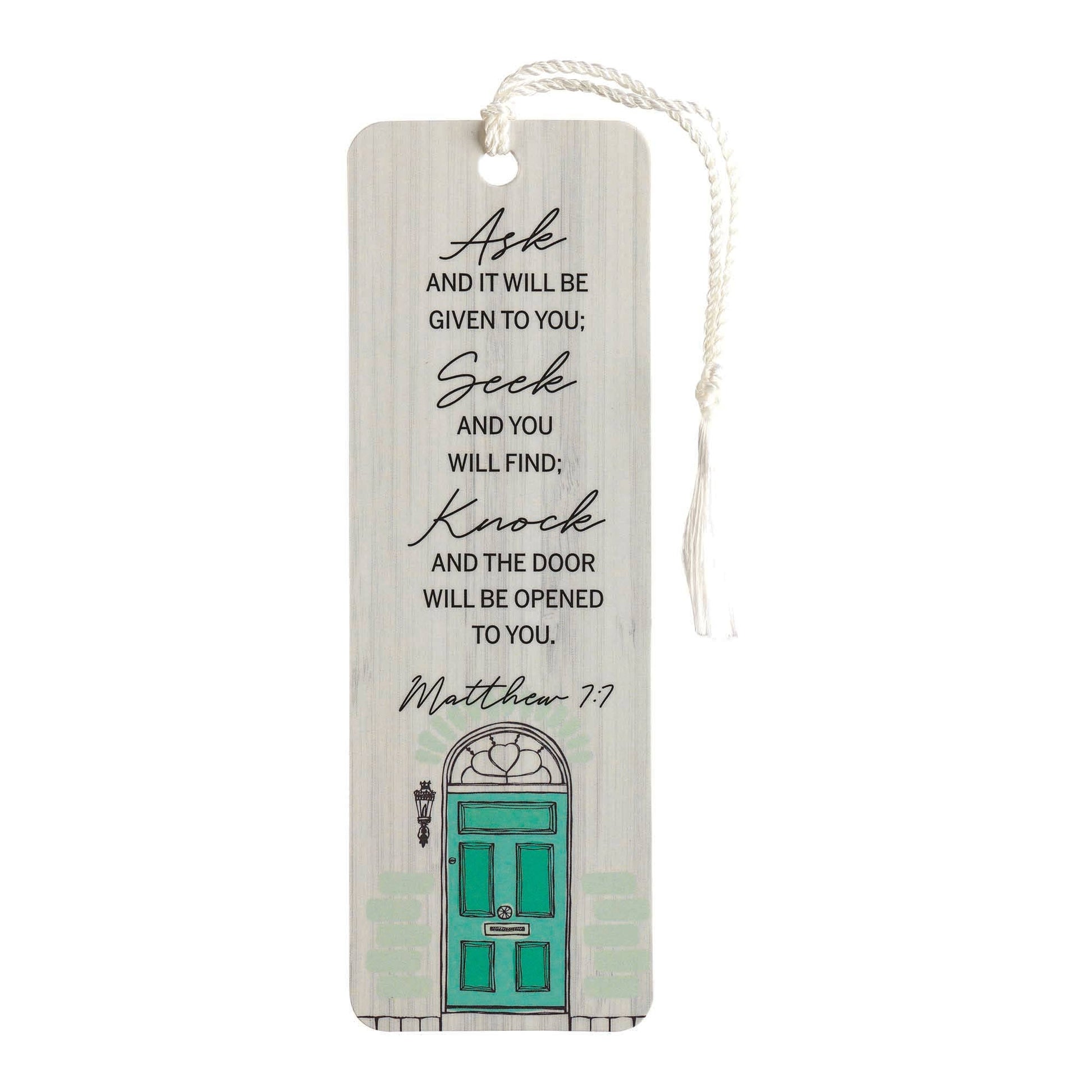 Ask, seek, knock tassel bookmark pack of 12 this bookmark is a beautiful reminder of Jesus' promises in Matthew 7:7, "Ask and it will be given to you; seek and you will find; knock and the door will be opened to you." finished at top with tassel cord. Back side has to and from spaces for writing in names, if desired. Sturdy paper stock is clear laminated for extra durability. Size of bookmark is 2" x 6". Sold in packs of 12.