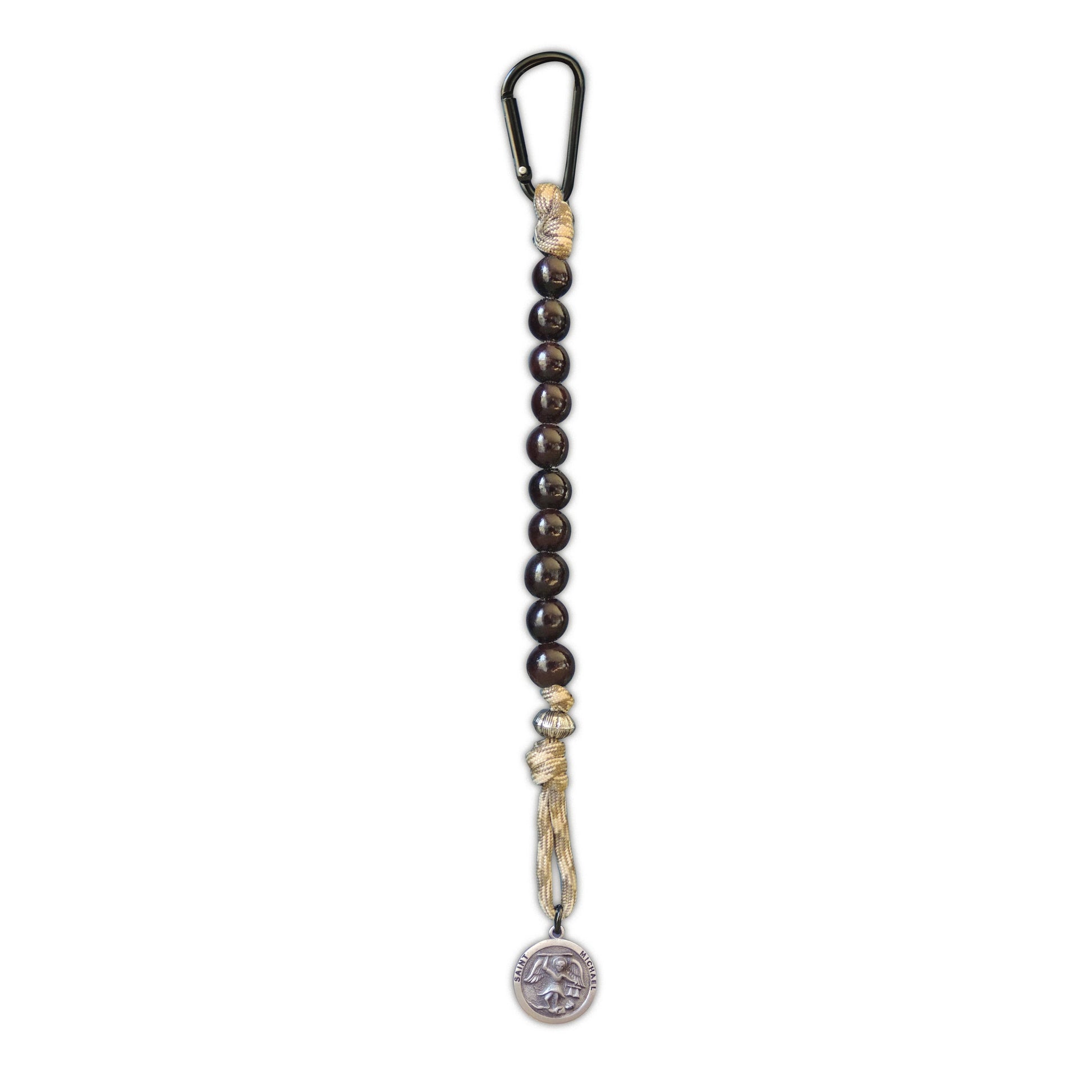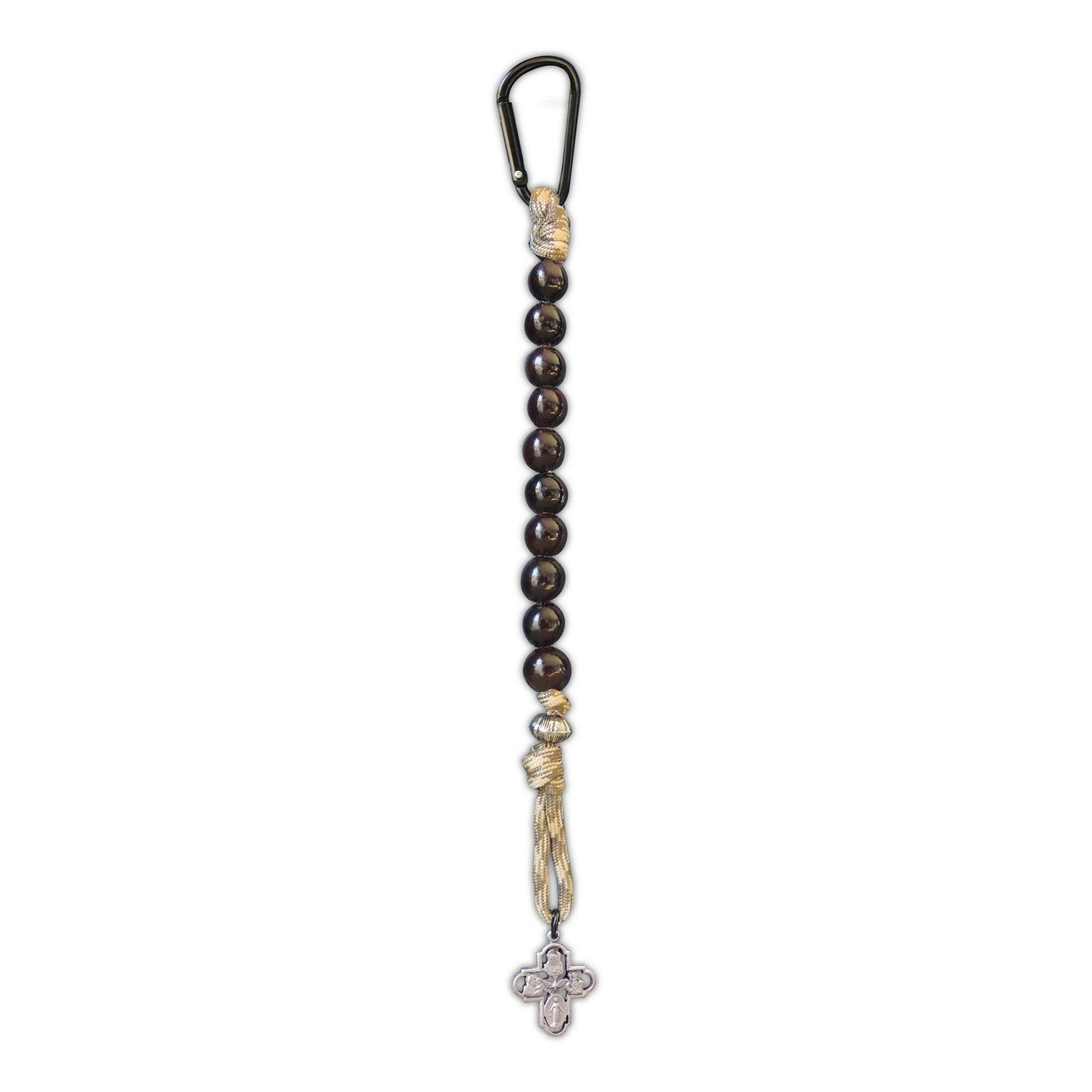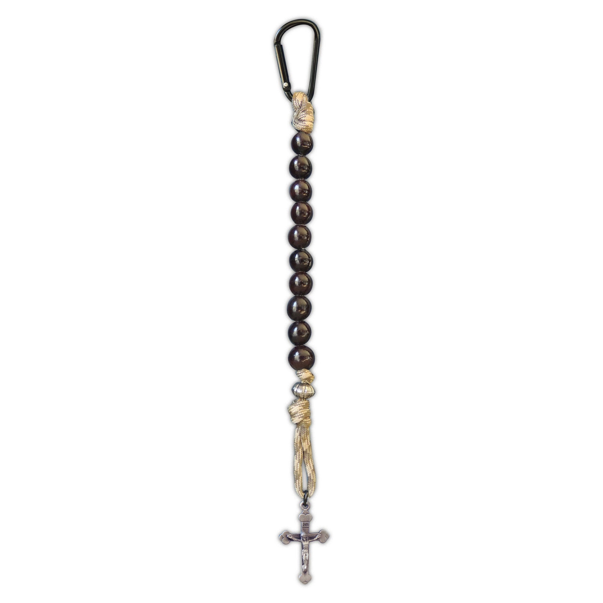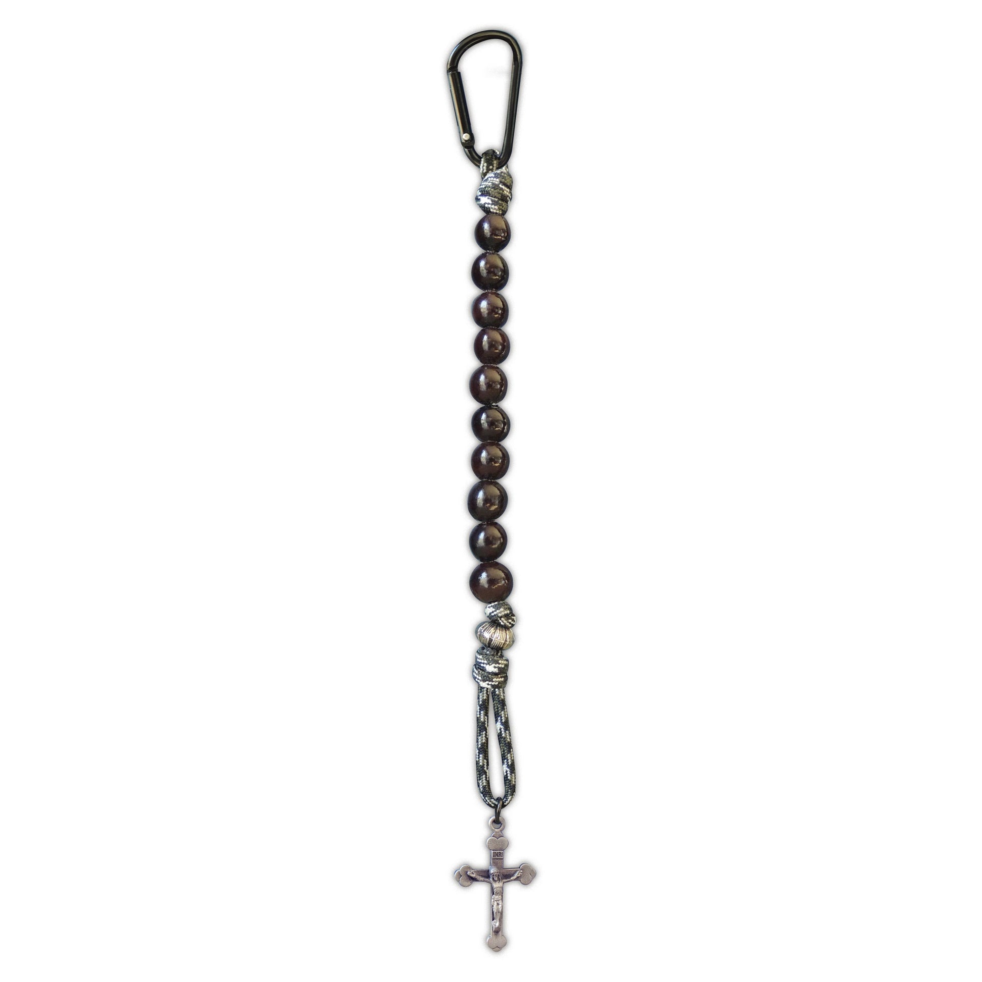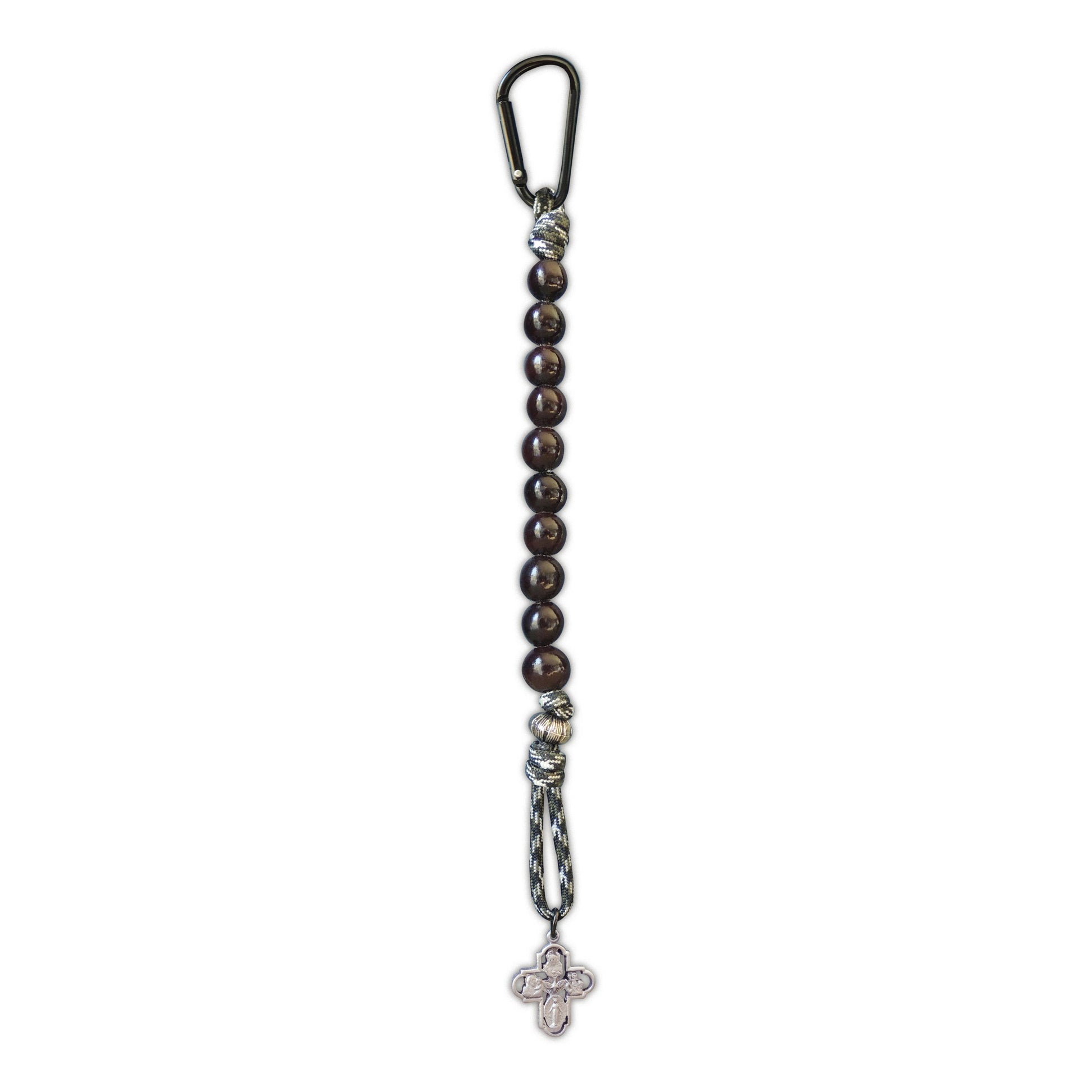 10 beads on paracord, in green or brown camouflage, with silver enamel finished metal charm, attach with mini carabiner.