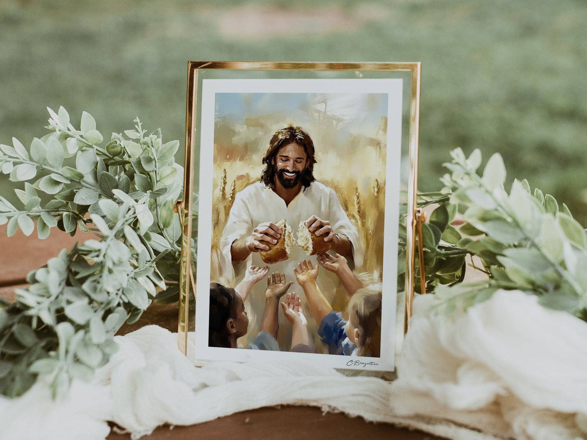 When I painted "Daily Bread," inspired by Matthew 6:11, I pictured the what the Savior Himself might look like at Thanksgiving. We see Him smiling, breaking fresh bread, and placing it into eager little hands. Behind Him, golden wheat fields glow in the warm light, symbolizing the truth that every blessing, both spiritual and physical, comes from Him. This piece is my way of turning the simple line from the Lord’s Prayer into a scene of joy, generosity, and grace.
