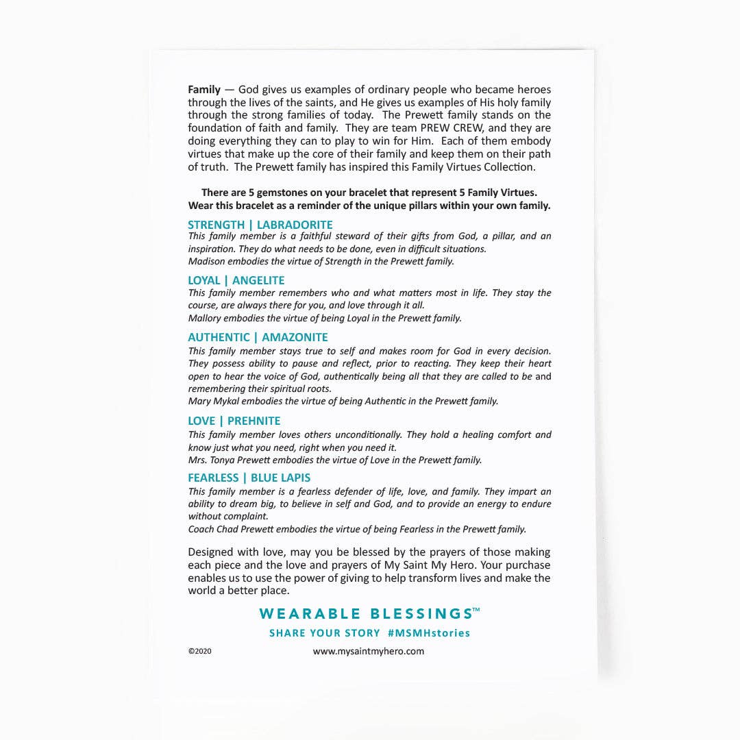 Inspired by Madison Prewett and her family - The Prew Crew Family Virtues Collection represents the importance of family and serves as a reminder of your role in that family. A family is a TEAM and each team member matters! It is so important right now to feel a sense of community and to remember that YOU have a purpose! This collection celebrates the family as a whole. Each bracelet represents important virtues: strength, loyalty, authenticity, love, and fearlessness. Wear this bracelet as a reminder to embrace these virtues and carry them with you in your daily life.