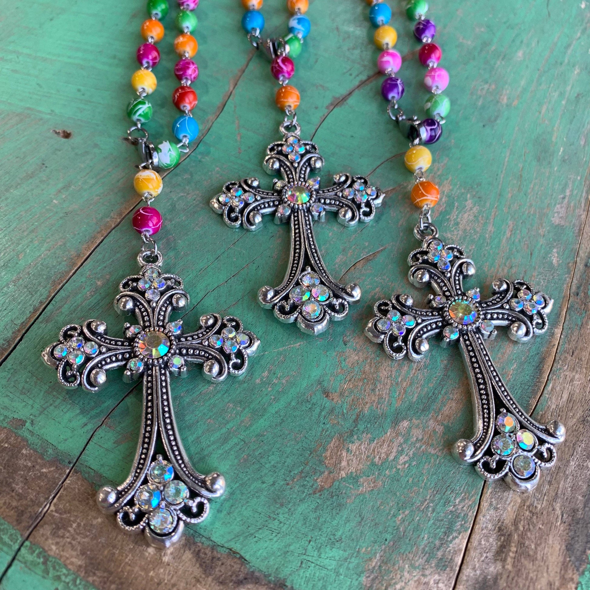 Gorgeous crystal cross with colorful fiesta beads! To protect you on the road. Can be added to car, purse, or door.