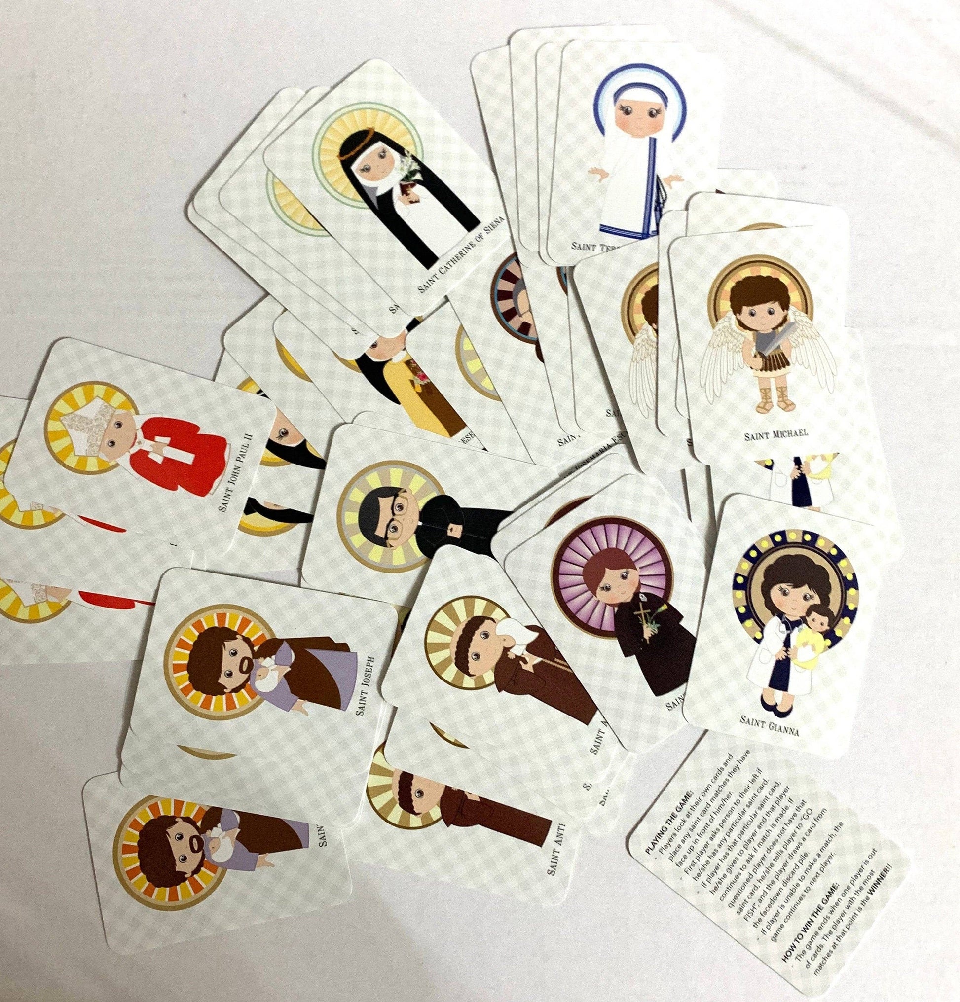 Set includes 12 different saints with adorable illustrations and patterns. 48 cards total (4 of each saint shown)!