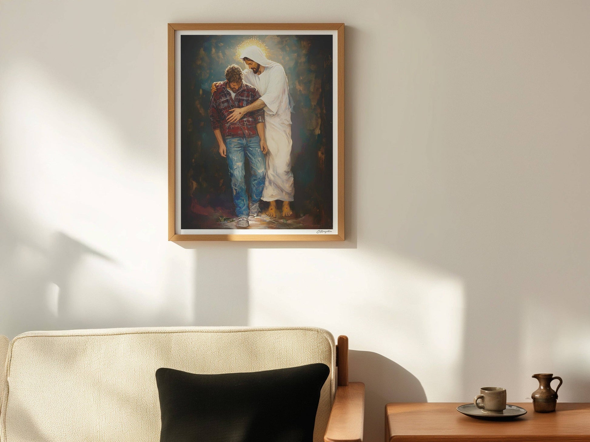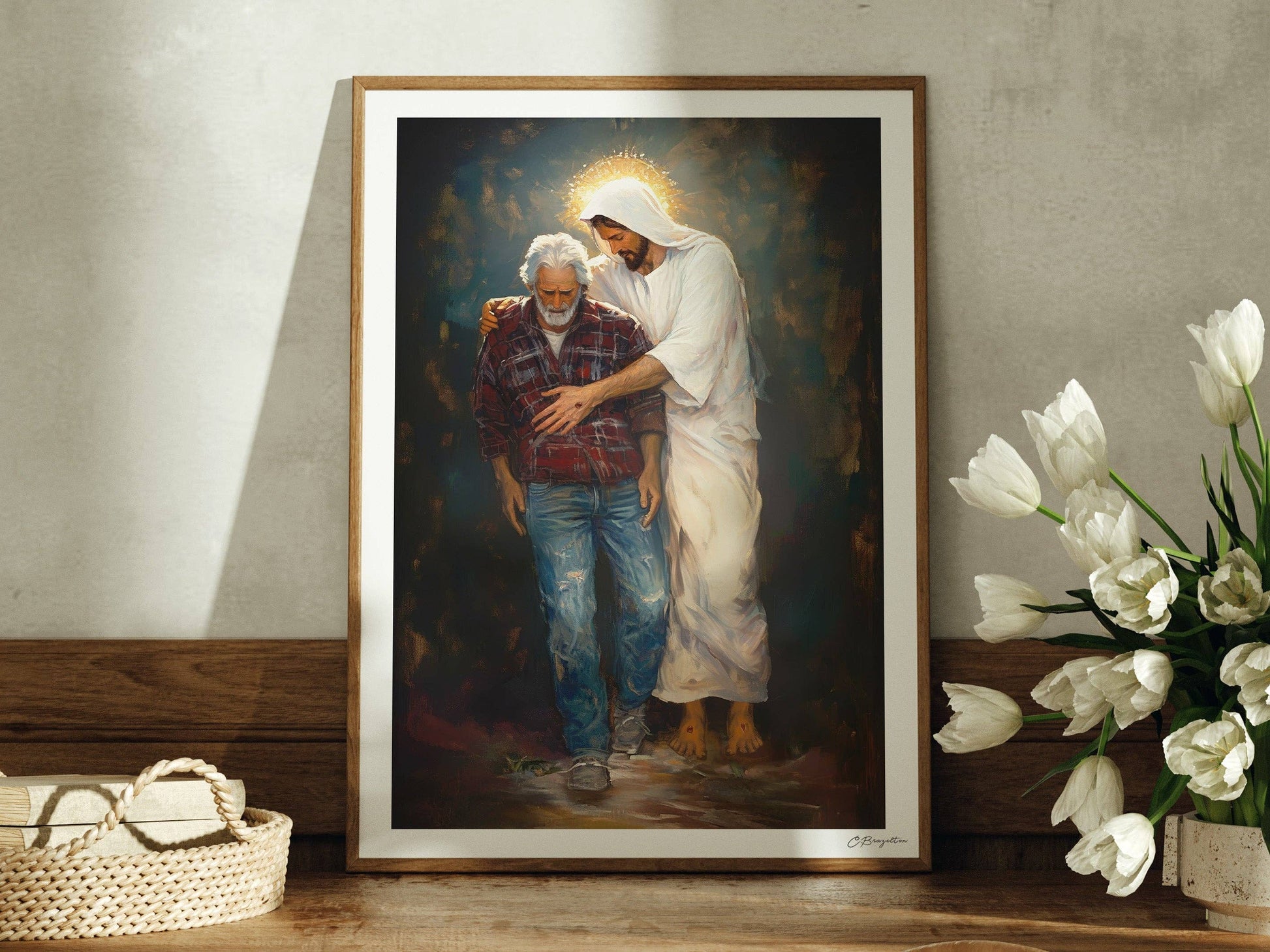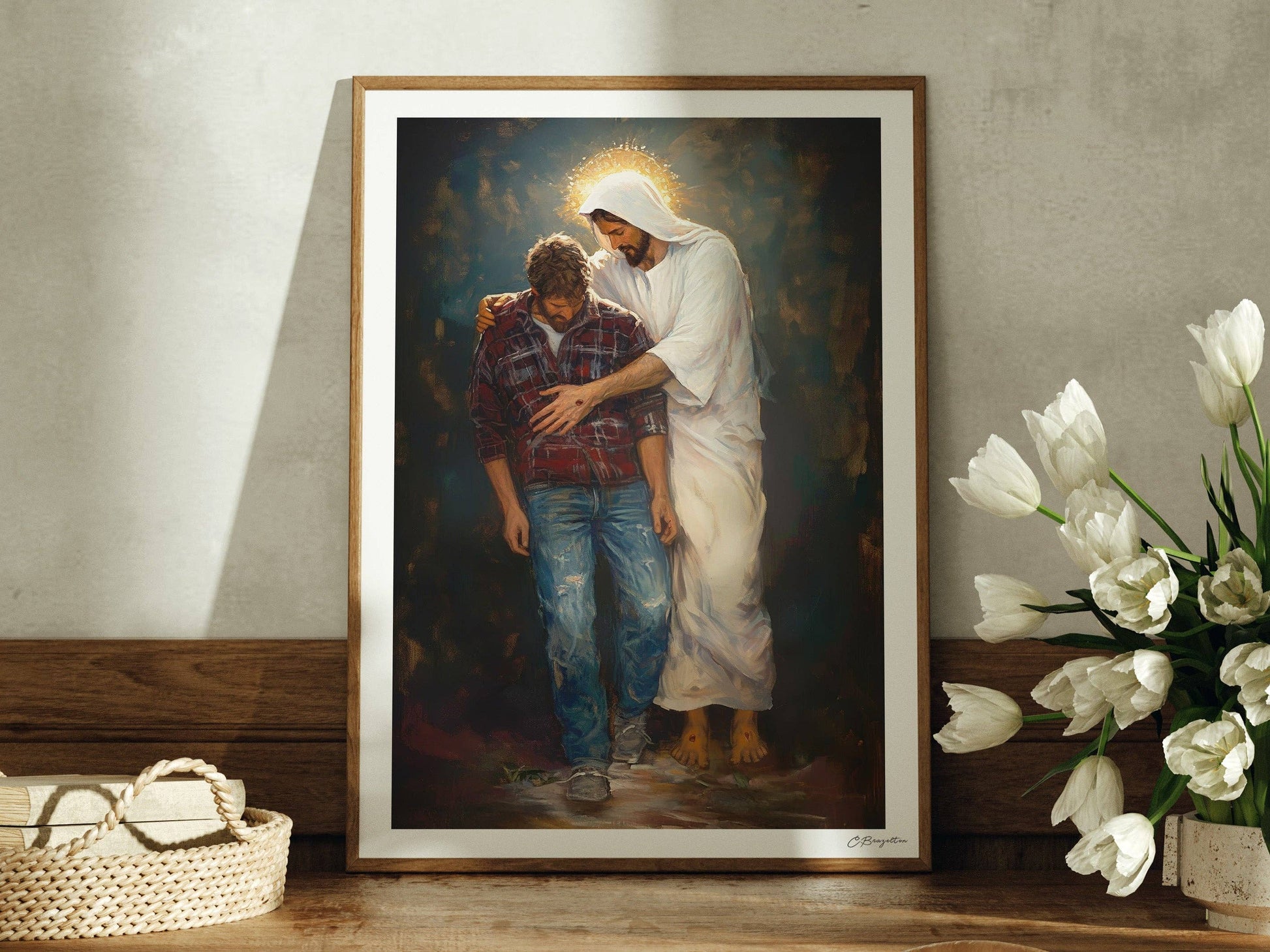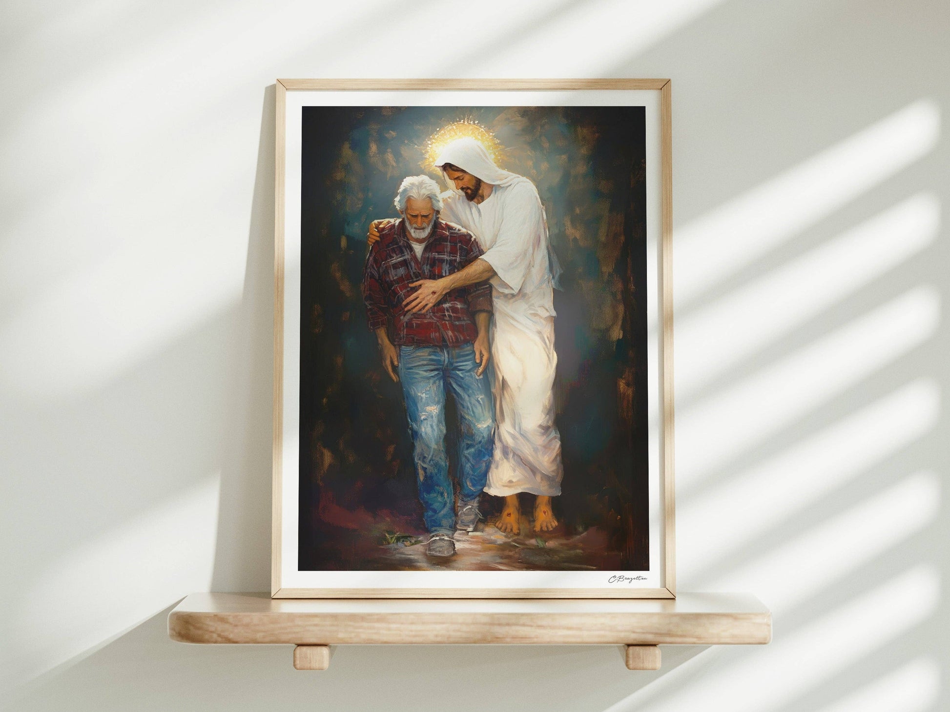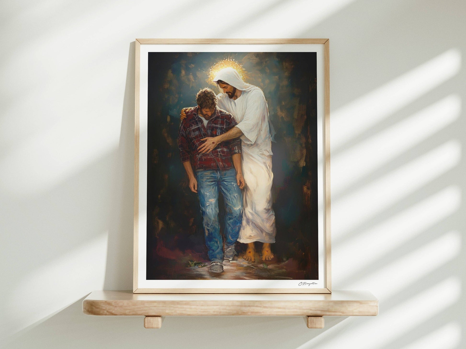 “Cast all your anxiety on Him because He cares for you.” (1 Peter 5:7). Lean on Him shows a powerful moment between Jesus and a weary man. The man, burdened and exhausted, leans heavily on the Savior, and Jesus holds him close, supporting him through his struggles.
