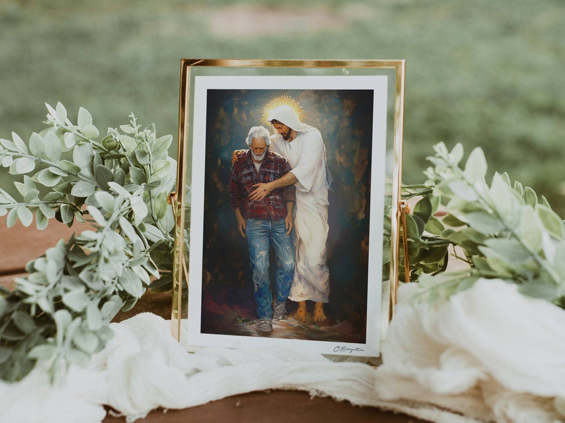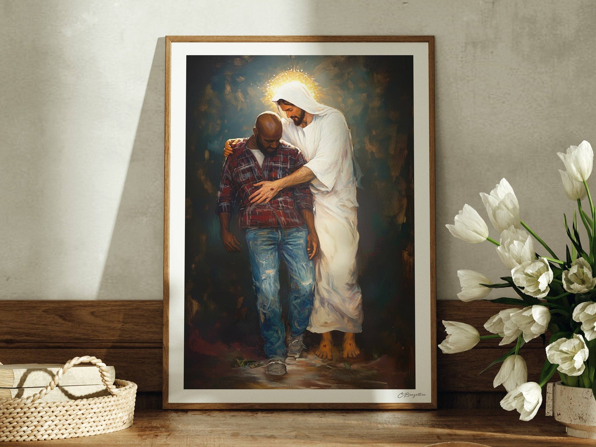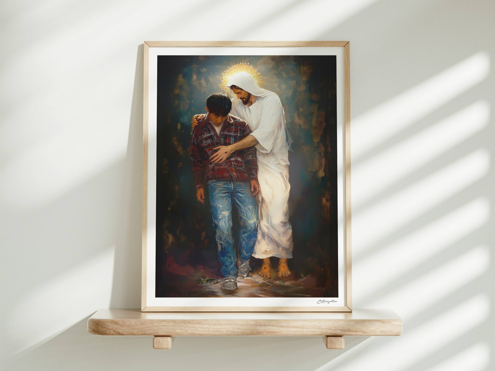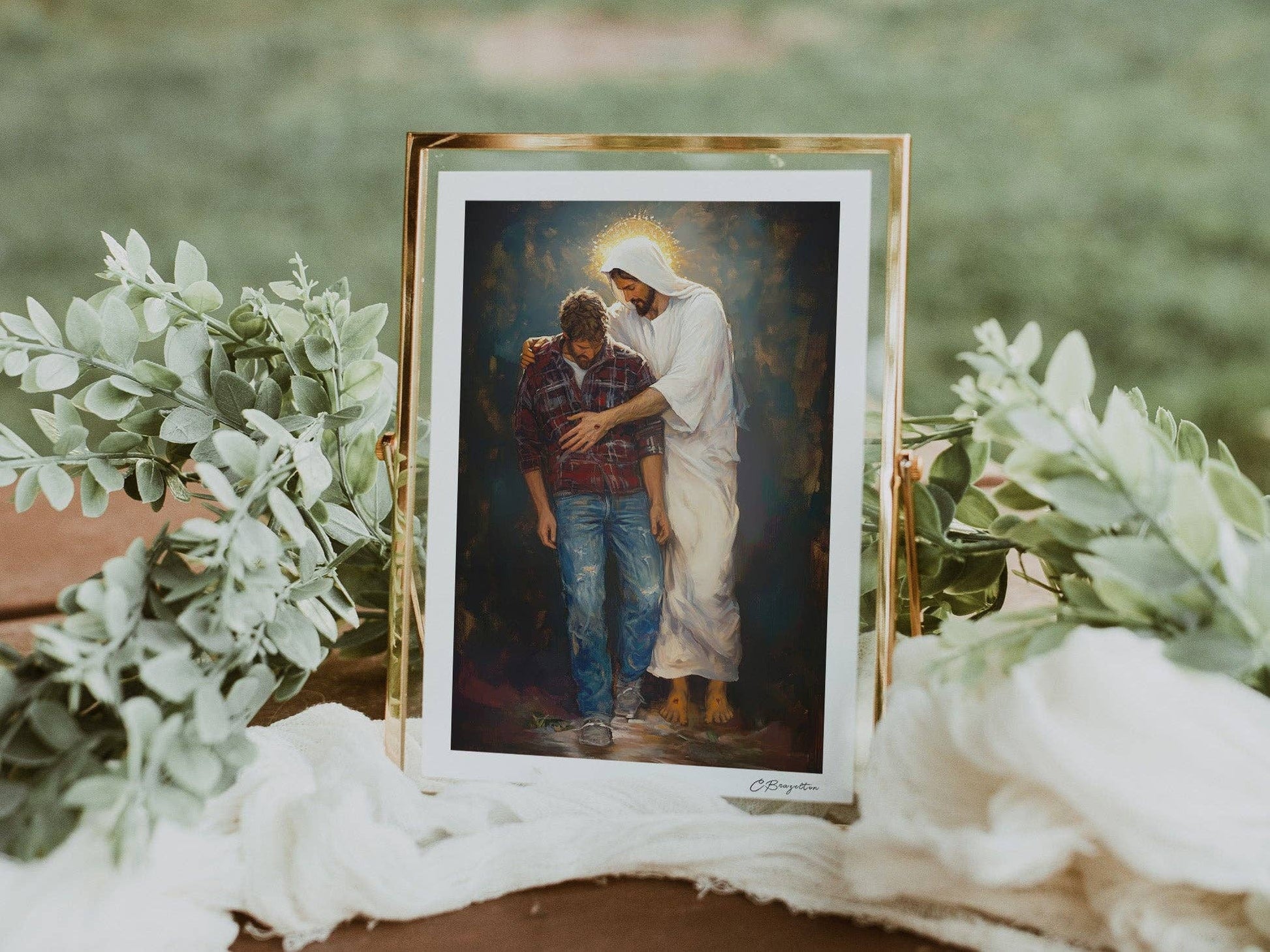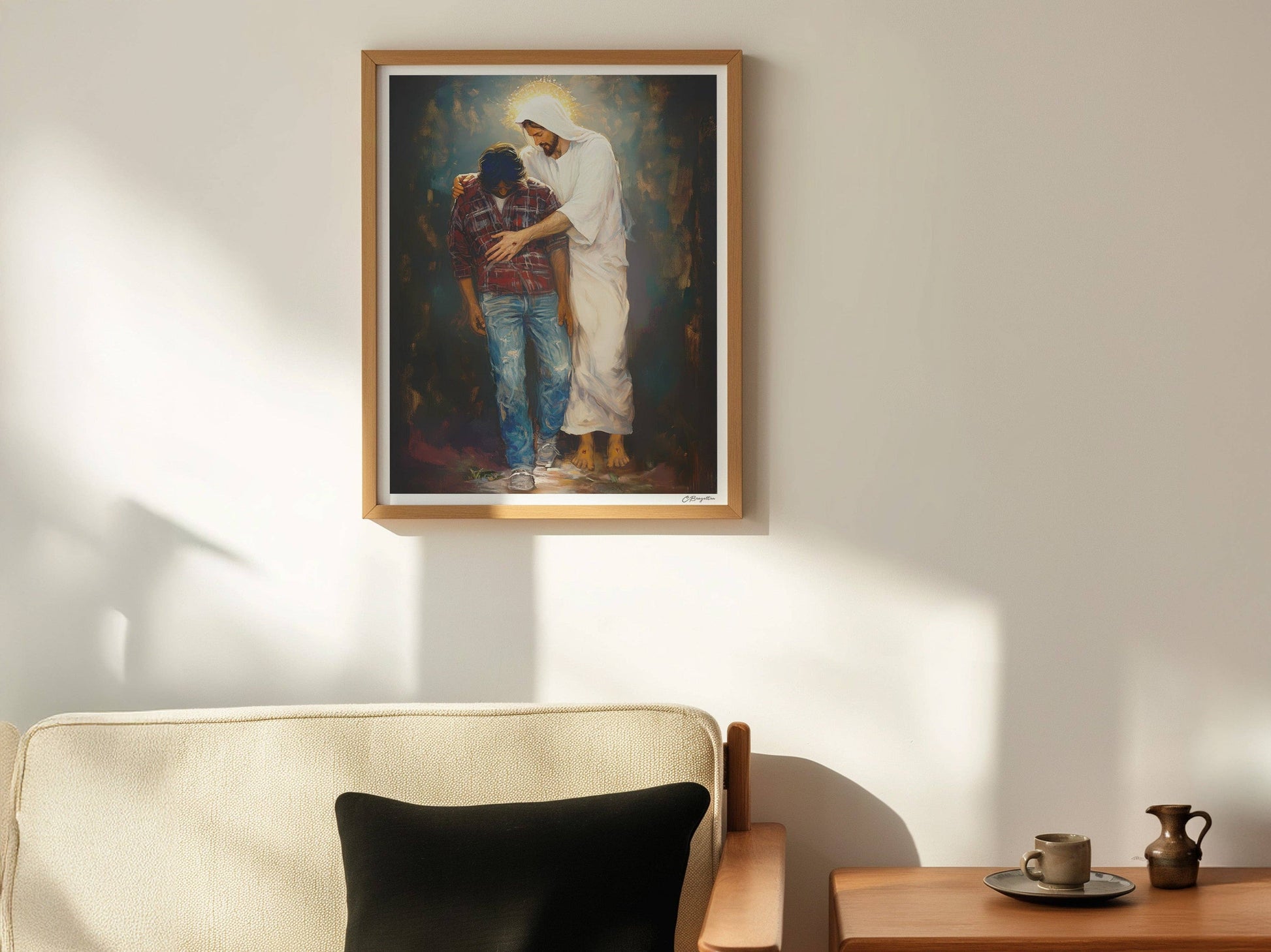“Cast all your anxiety on Him because He cares for you.” (1 Peter 5:7). Lean on Him shows a powerful moment between Jesus and a weary man. The man, burdened and exhausted, leans heavily on the Savior, and Jesus holds him close, supporting him through his struggles.