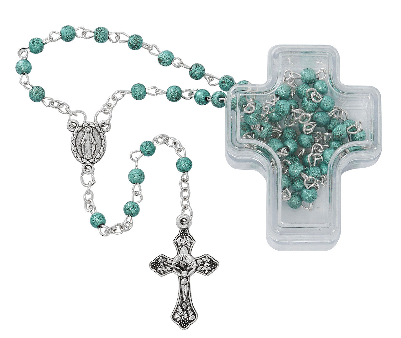 BLUE FROSTED BEADS WITH PLASTIC CROSS BOX.