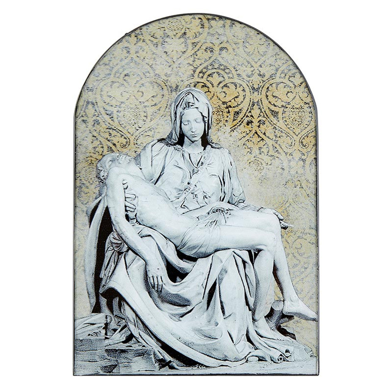 These arched plaques feature painted wood accented with rich gold tones and include an easel for standing and a hook for hanging.