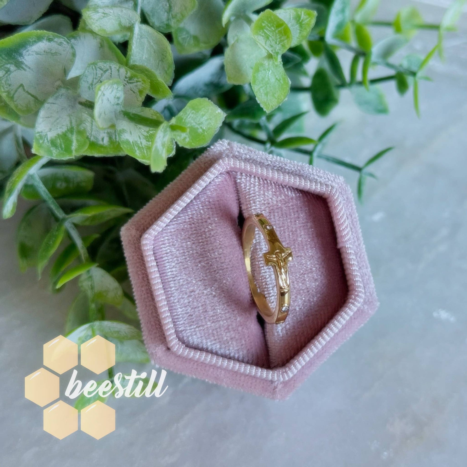 Petit Rosary Ring featuring 10 CZ made in non tarnish, hyper allergenic, and waterproof 18k plated material.