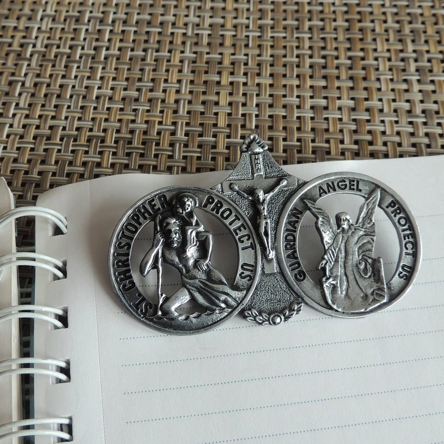 Auto visor clip in bright finish, St. Christopher & guardian angel, drive safely message, carded.