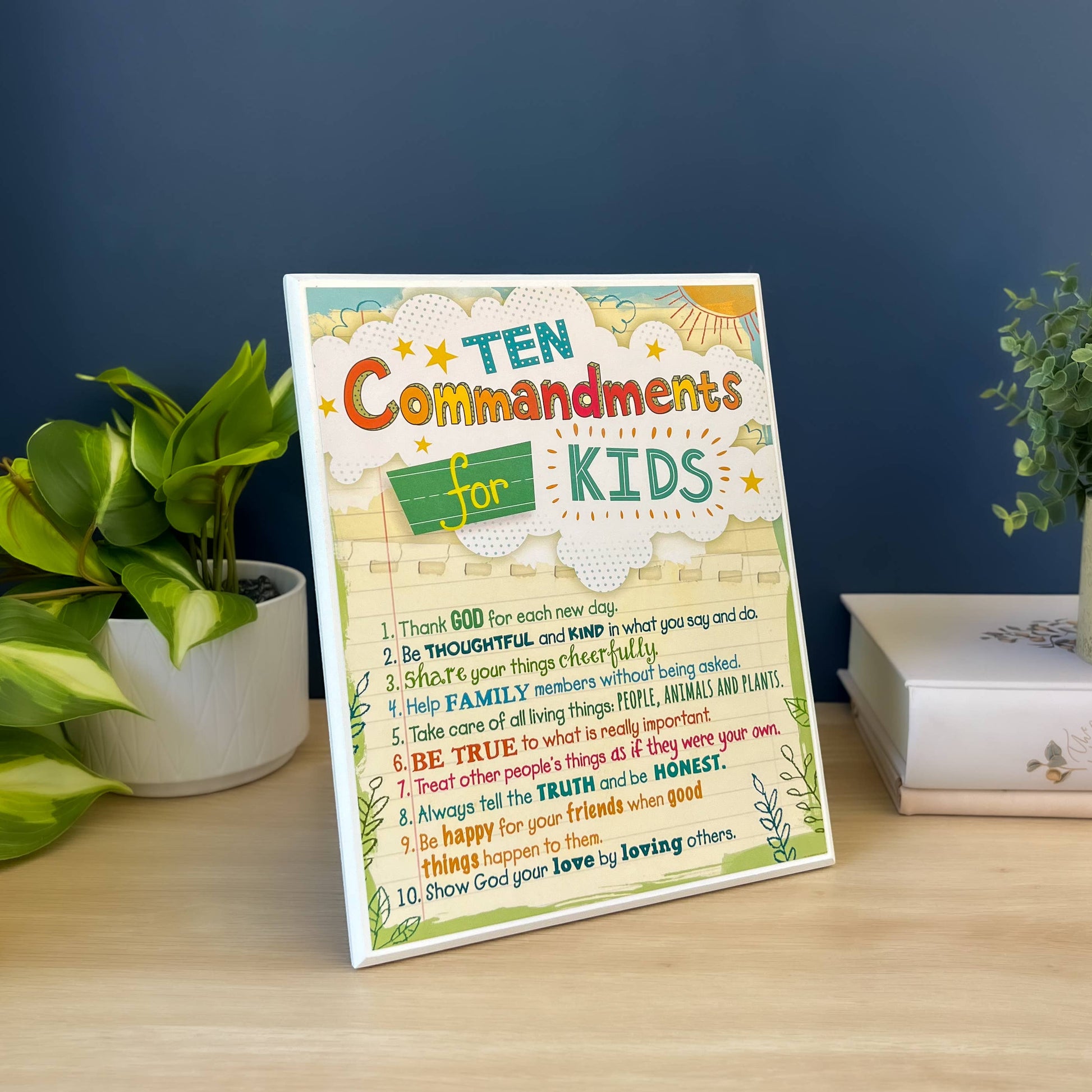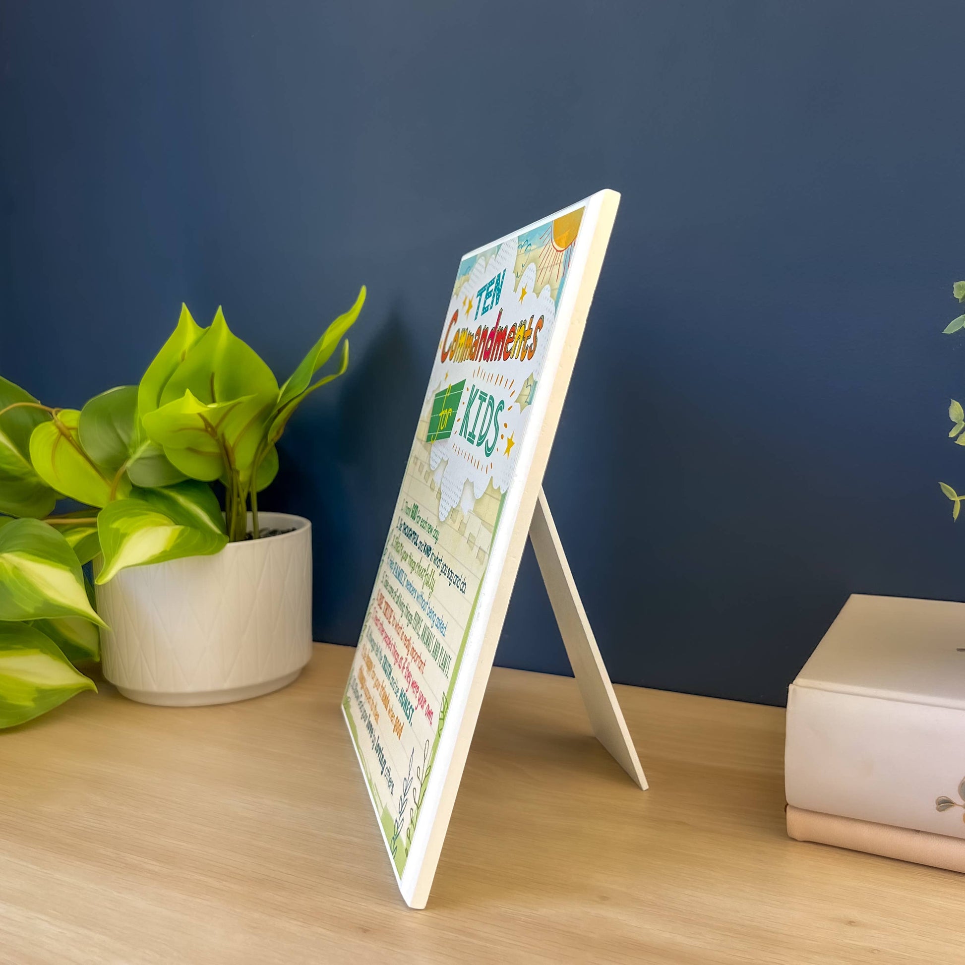 Wall plaque made of MDF with vibrant printed facing featuring 10 rules to live by for children. Hangs or stands.