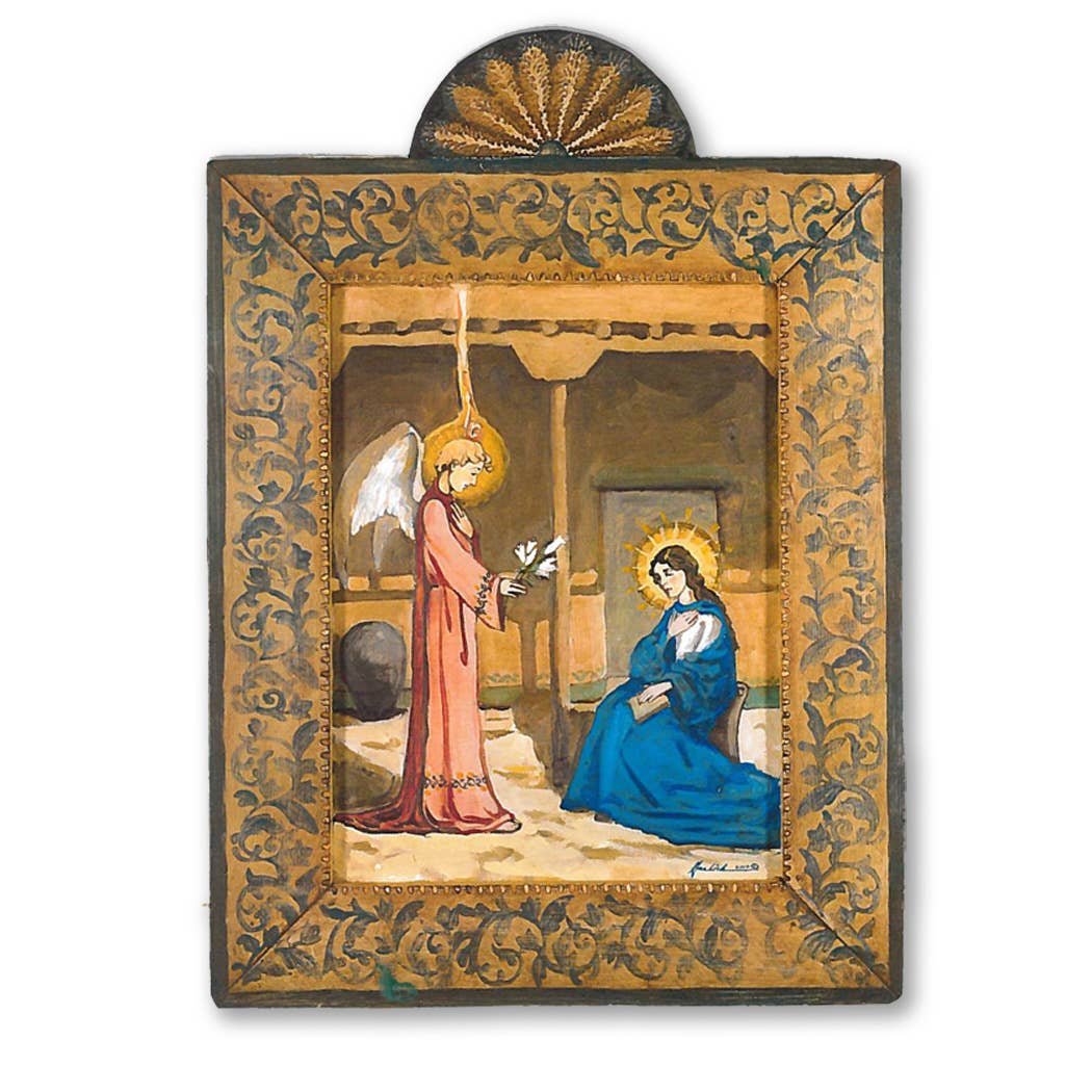 Gabriel the archangel comes to Mary as the Messenger of God to announce that she is to be the Virgin prophesied in Isaiah 7:14. There are countless depictions of this beautiful scene that have been made throughout the centuries and they all have elements that are symbolic. Here, the scene is placed in New Mexico. The post that divides the angel from Mary represents their different worlds of heaven and earth. Mary holds the book with the prophecy in it. Gabriel offers her lilies, representing her purity. Mary is depicted with full recognition of the weight of Gabriel's message and what she will face because of it. The room behind her is God's bedchamber. The pot represents the pending pregnancy.