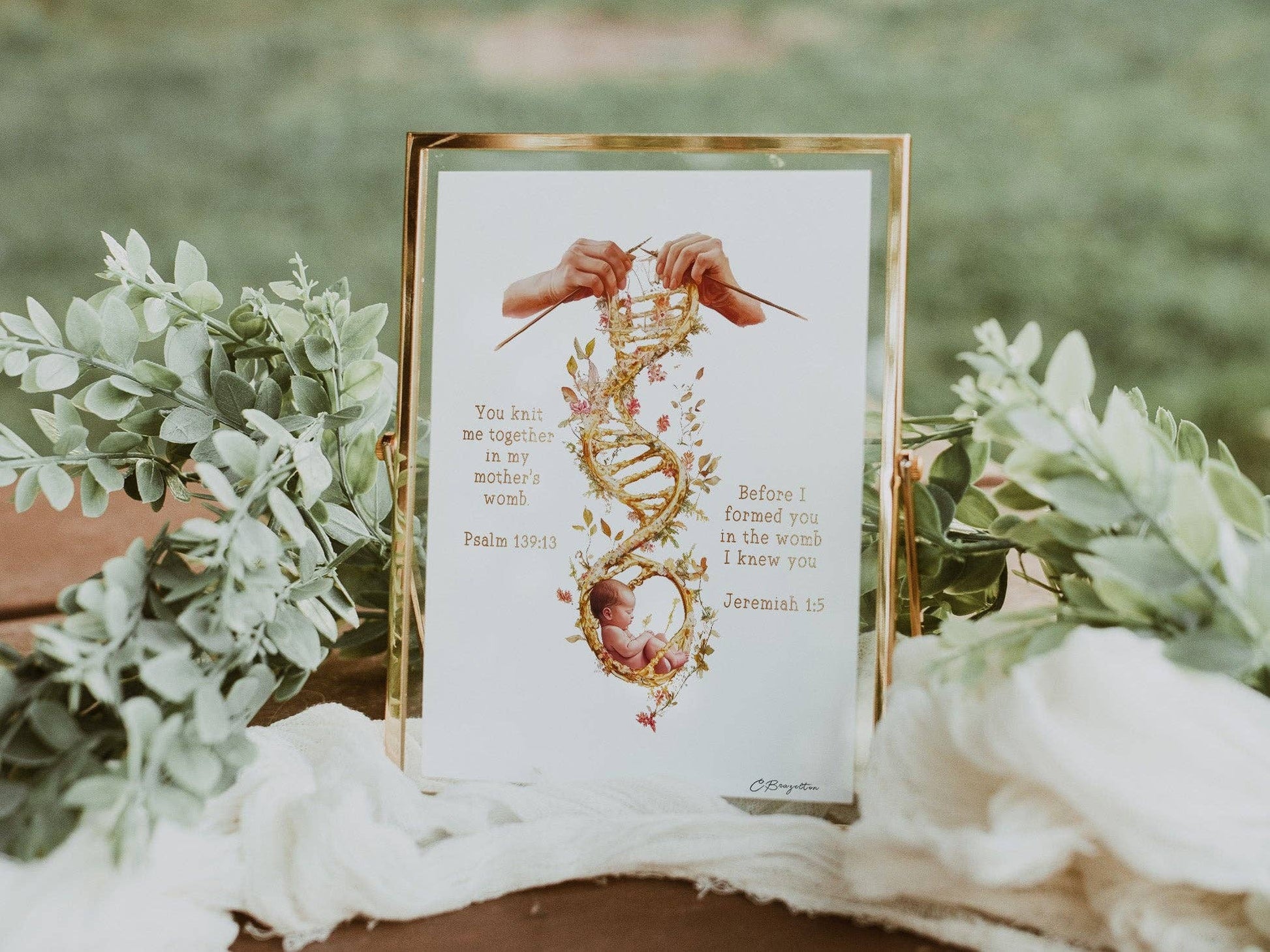In "You Knit Me Together," I wanted to show the miracle of God’s loving care as described in Psalm 139:13, “You knit me together in my mother’s womb,” and Jeremiah 1:5, “Before I formed you in the womb, I knew you.” This painting symbolizes the truth that every life is wonderfully made and known by our Heavenly Father even before birth.